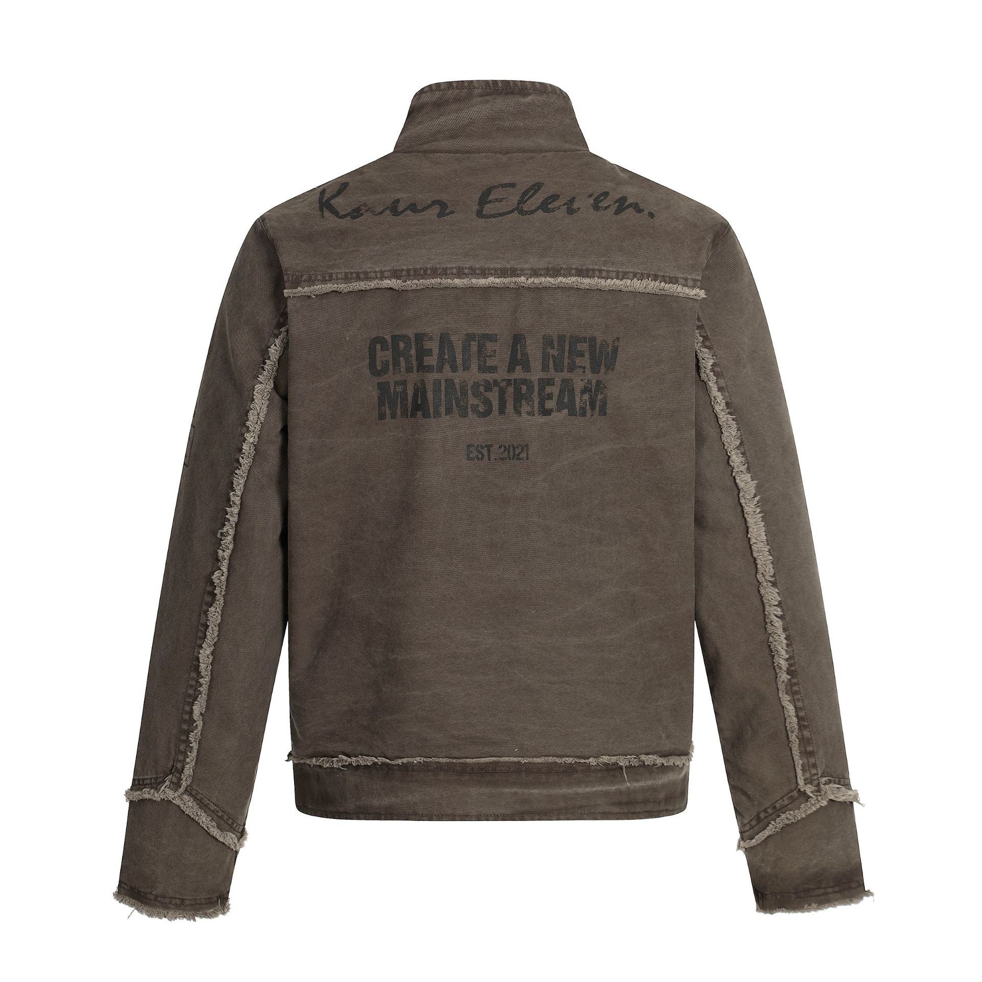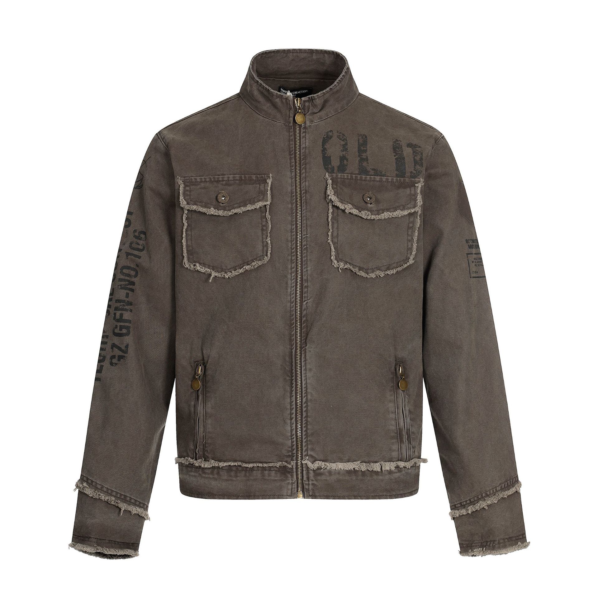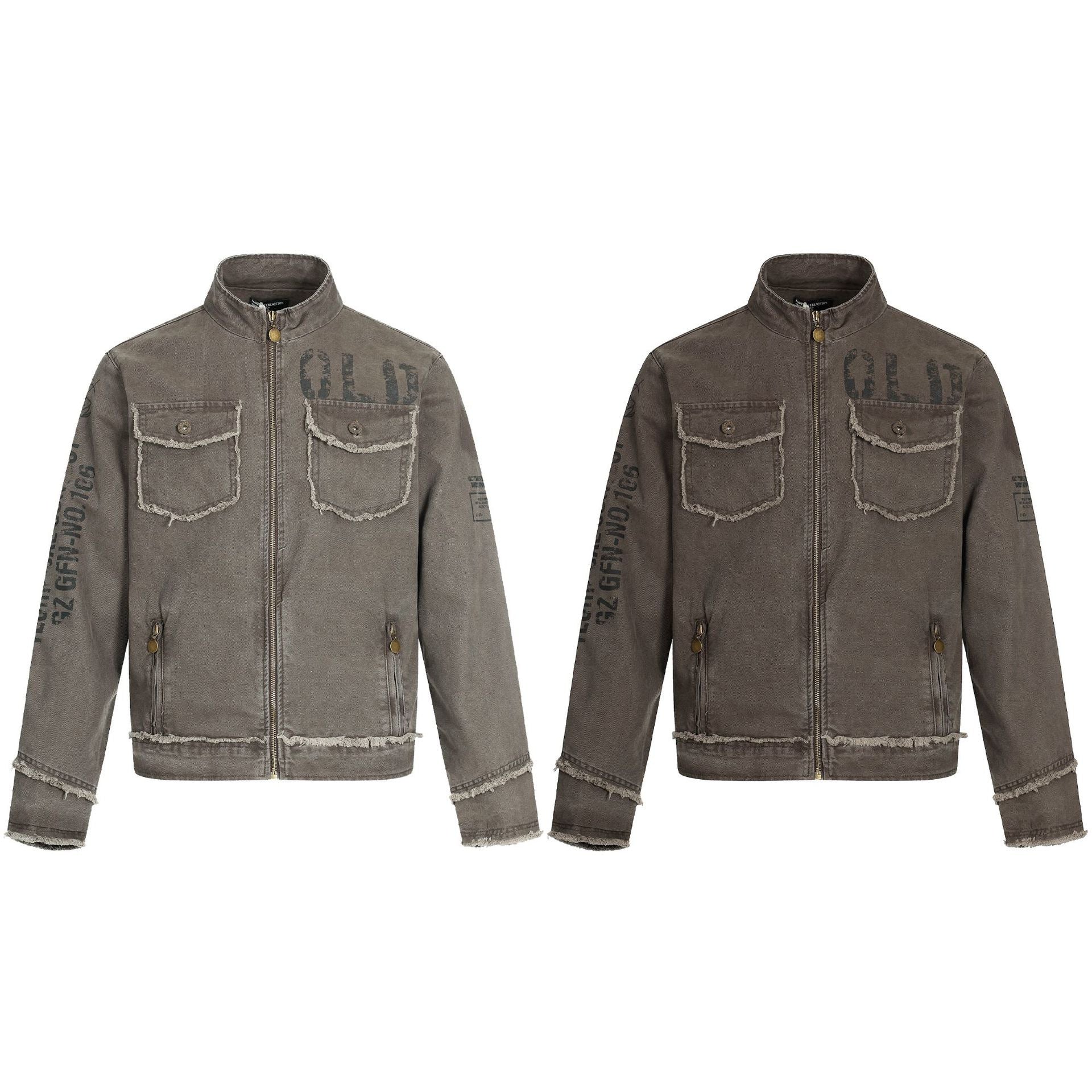 Jacket Stand Collar Outerwear Unisex Vintage Print Washed Zipper Frayed Aged