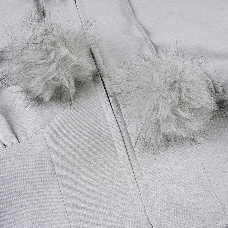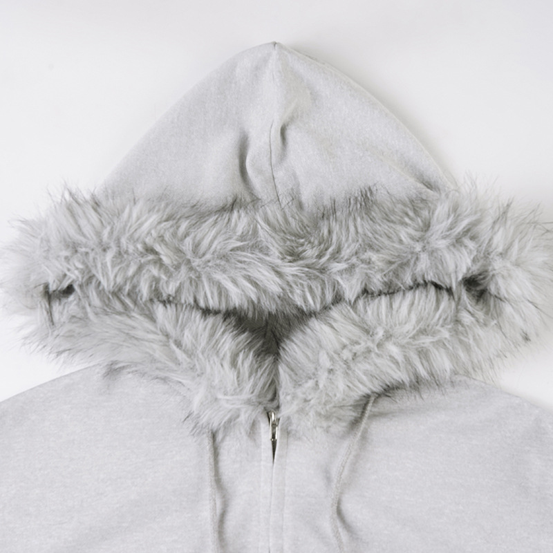 Street Style Fuzzy Collar Hooded Sweatshirt Cinched Waist Irregular Short Length Spicy Design Long Sleeve Jacket